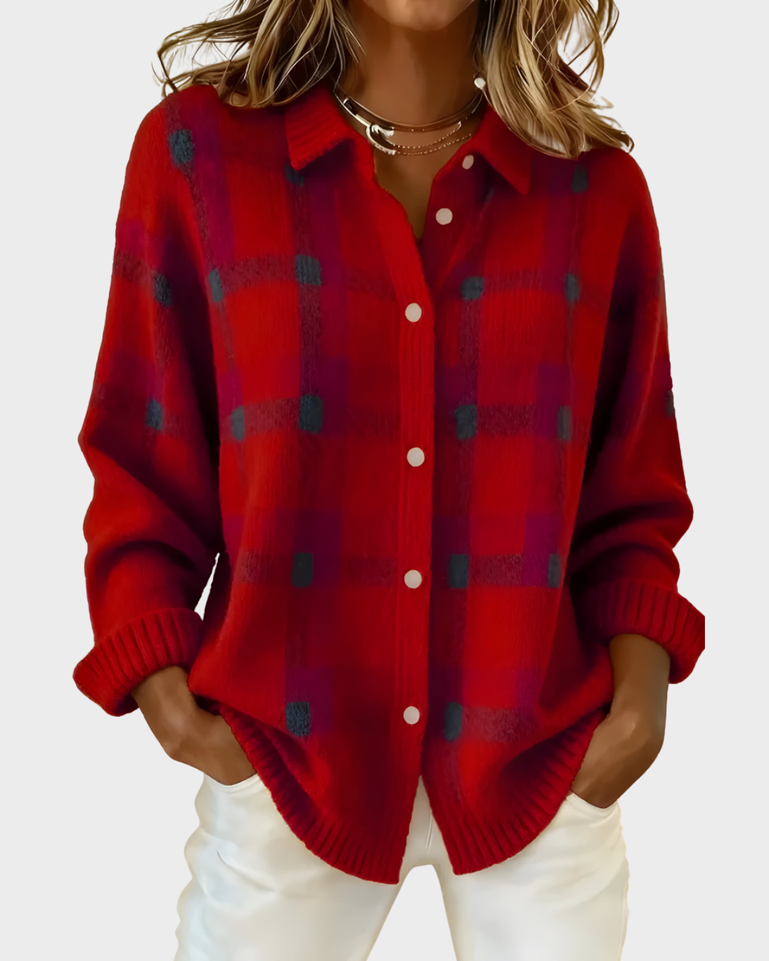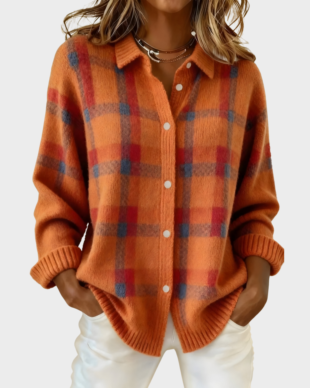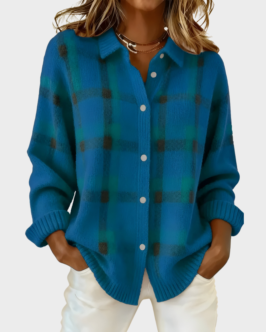 O nosso popular cardigan Ana combina conforto acolhedor com um padrão clássico aos quadrados, ideal para os dias mais frescos. É uma peça versátil e fácil de usar, pensada para quem gosta de um estilo descontraído mas cuidado. Um modelo intemporal que se adapta a qualquer guarda-roupa.