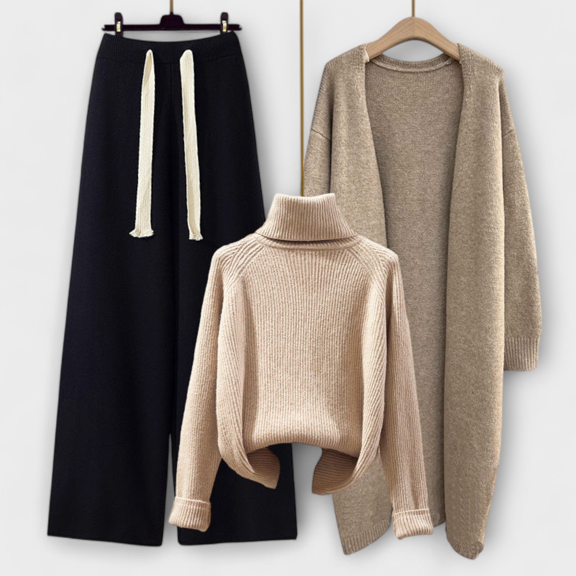 • Conjunto completo de 3 peças – Inclui um suéter de gola alta, um cardigã longo e uma calça de cintura alta e perna larga para um look harmonioso.
