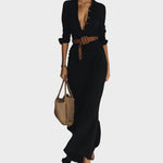 Este elegante vestido comprido destaca-se pelo cinto que realça a cintura, criando uma silhueta feminina e sofisticada. As mangas compridas com punhos dão-lhe um toque clássico e refinado, enquanto o corte fluido garante conforto e liberdade de movimento durante todo o dia. Perfeito para um look chique e elegante em qualquer estação.