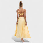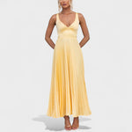Este deslumbrante vestido amarelo plissado é a escolha ideal para quem quer destacar-se com charme e sofisticação. Com um corte fluido e um decote cruzado que valoriza a silhueta, é perfeito tanto para eventos especiais como para um jantar ao pôr do sol. A leveza do tecido e o movimento das pregas criam uma sensação etérea que não passa despercebida.