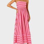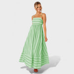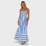 Este vestido comprido com alças finas e padrão às riscas é a definição de frescura e feminilidade. O corte amplo e fluido proporciona movimento natural e um ajuste perfeito — ideal para dias mais quentes ou passeios descontraídos. A cintura subida realça as curvas de forma elegante, enquanto o decote direito acrescenta um toque moderno e delicado à peça.