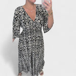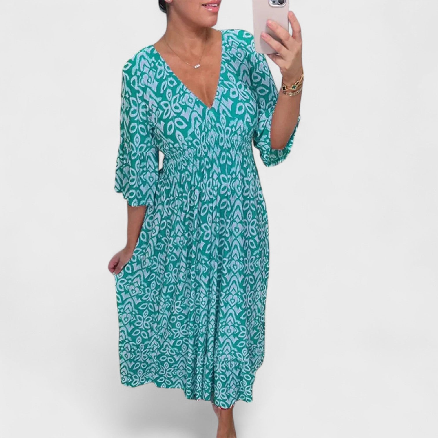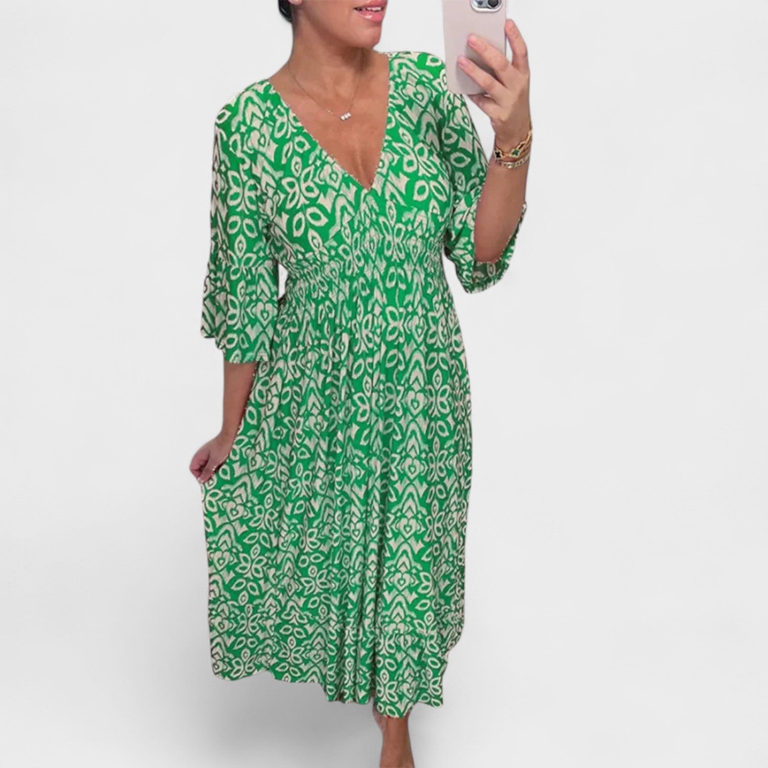 Detalhes que Encantam: Decote em V, mangas 3/4 elegantes e um franzido na cintura que realça a feminilidade.
